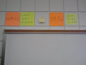 p.s. I wonder if I can string these together into a meaningful schema; I’m still playing with that possibility. As the picture shows, I am posting them above the white board, too–for regular reference and reinforcement. The little post-it signals the possibility of students’ placing an original piece of visual art to render each skill. Time will tell.